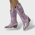 These cowboy boots combine the essence of Western style with a modern and refined touch. With a mid-calf design, pointed toe, and low clog heel, they are perfect for stylishly accompanying you in both everyday life and special occasions.