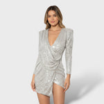 This long-sleeve mini dress combines a flattering V-neck with a modern and eye-catching design perfect for spring. Its asymmetrical cut adds movement and personality, creating a fresh and sophisticated silhouette ideal for special occasions or events where you want to stand out. A versatile piece that balances glamour and comfort with elegance.