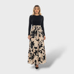 Show off a fresh and feminine style with this long women's dress featuring a floral print. Its A-line cut and short ruffled sleeves create a sophisticated and comfortable look, ideal for both special events and casual outings. The adjustable tie at the waist allows for an elegant accentuation of the silhouette.