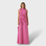 A long dress that combines clean lines with an artistic touch thanks to its 3D floral appliqués that delicately cascade down the silhouette. The structured neckline adds presence and modernity, while the fluid drape creates a soft and feminine movement. A perfect piece for those seeking a contemporary style with a subtly sophisticated focal detail.