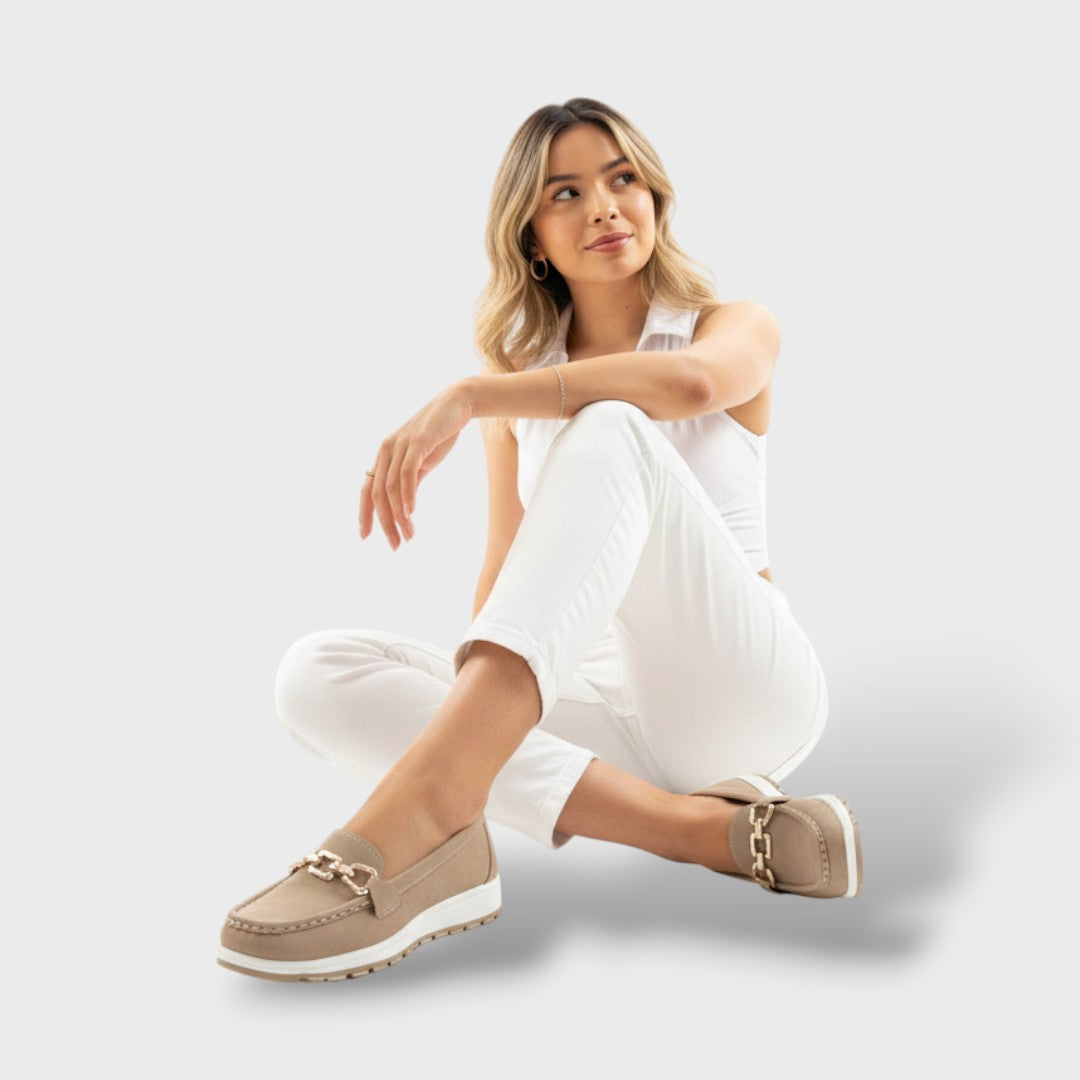 A pair of moccasins designed for everyday wear with a structured silhouette, flat sole with a slight wedge, and a soft finish that provides a clean and versatile style. The metallic detail on the upper adds a polished touch, while the non-slip sole and ventilated interior ensure comfort with every step. Ideal for working, running errands, or enjoying casual walks with complete comfort.