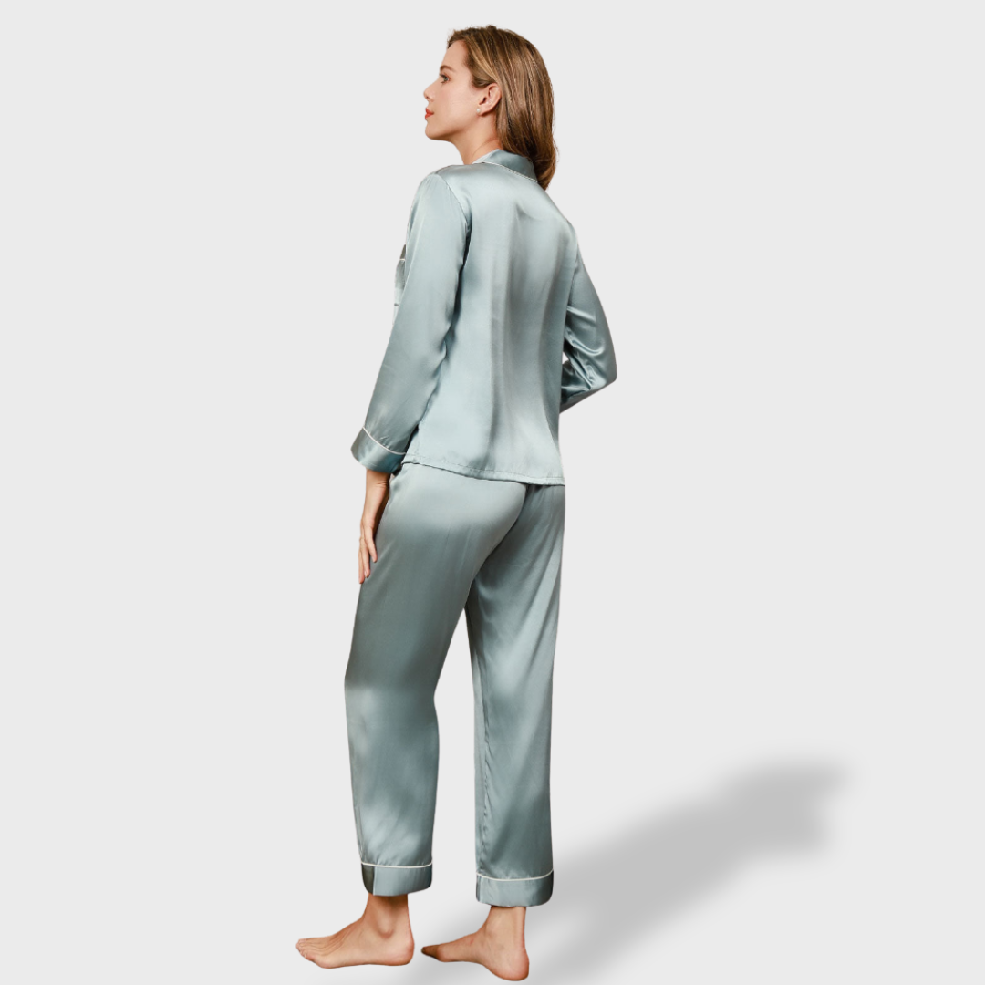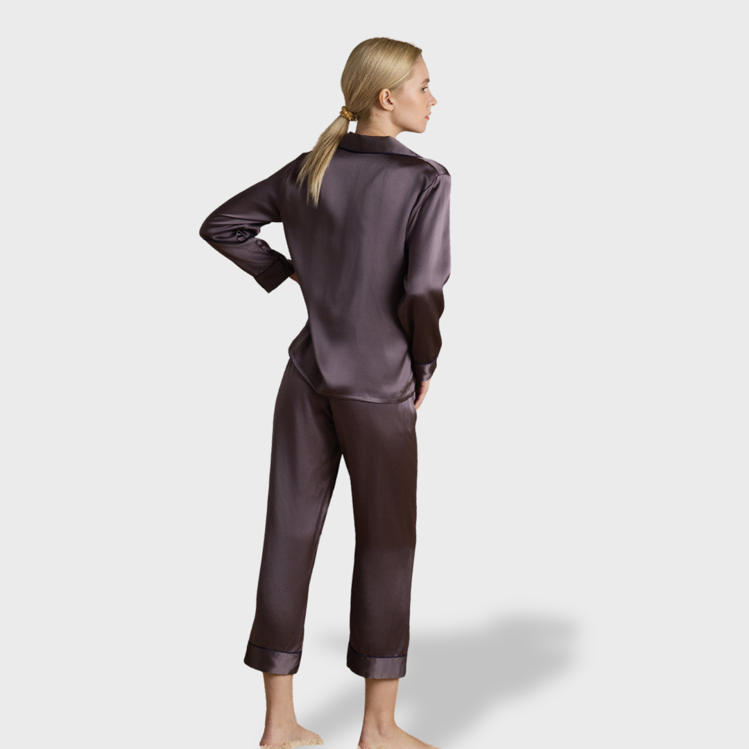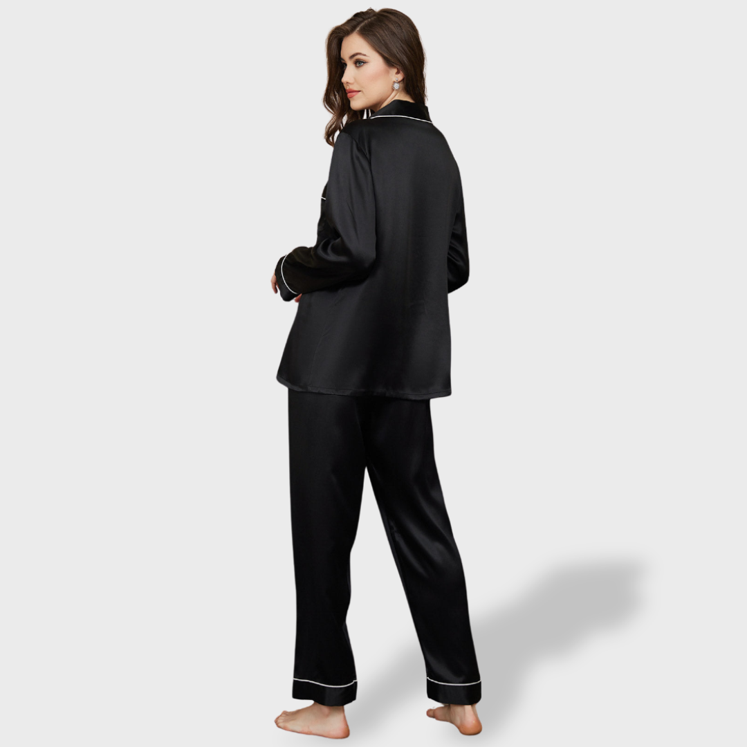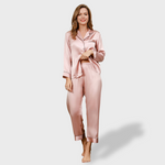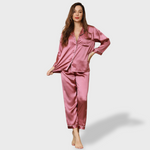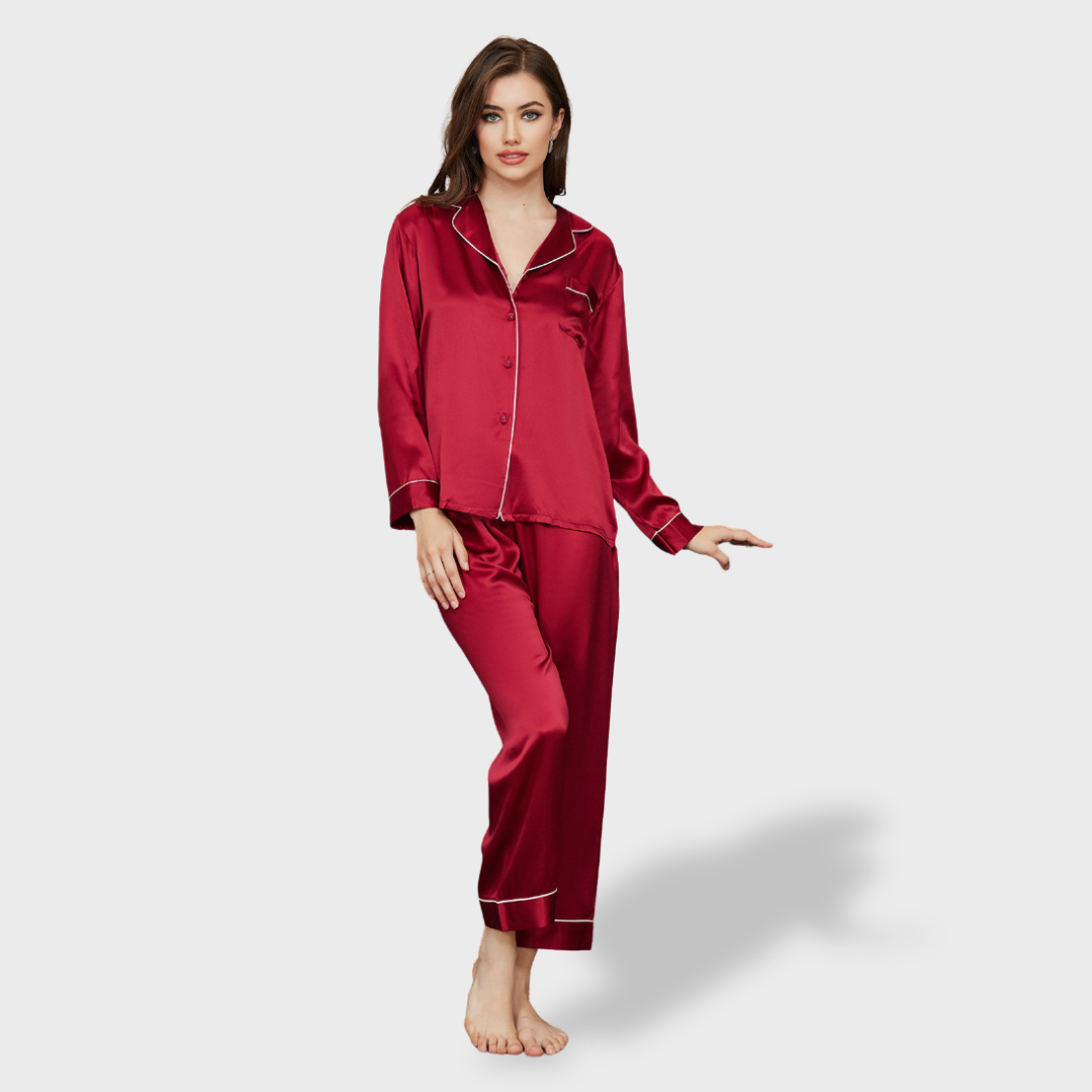 The Adriana set is made from soft, breathable, and lightweight fabric, ideal for sleeping or relaxing at home. Its classic two-piece design includes a long-sleeve shirt with a lapel collar, decorative trims, and a front pocket, paired with regular-fit long pants. Available in several elegant colors, these pajamas combine comfort with a sophisticated touch for any season.