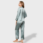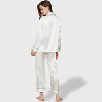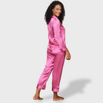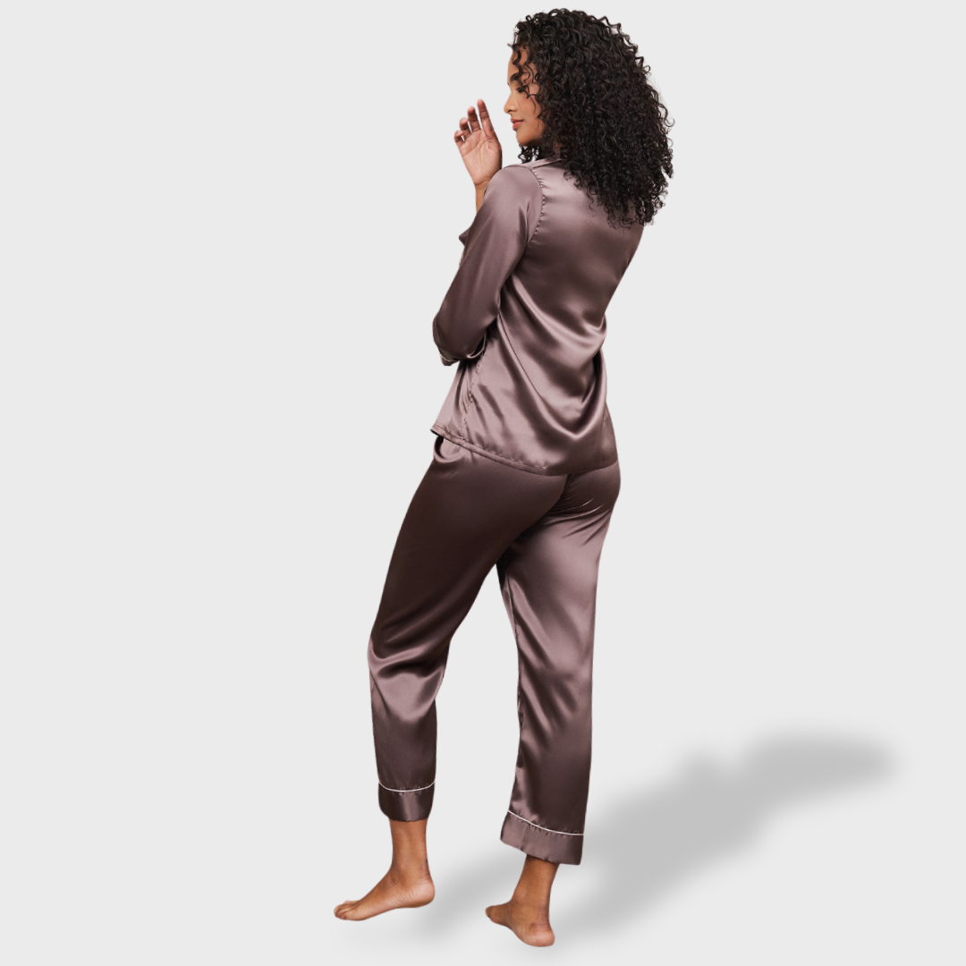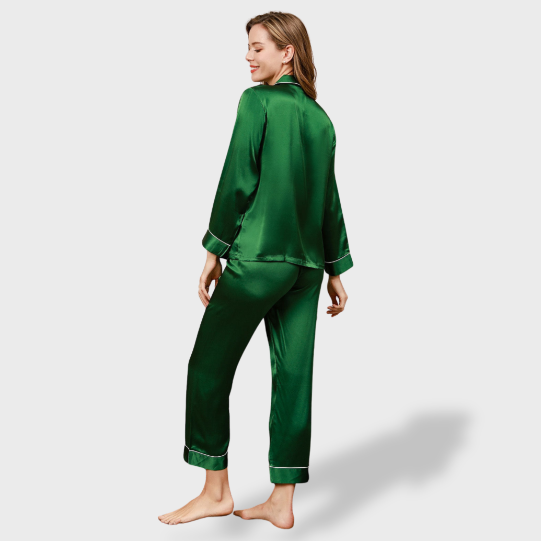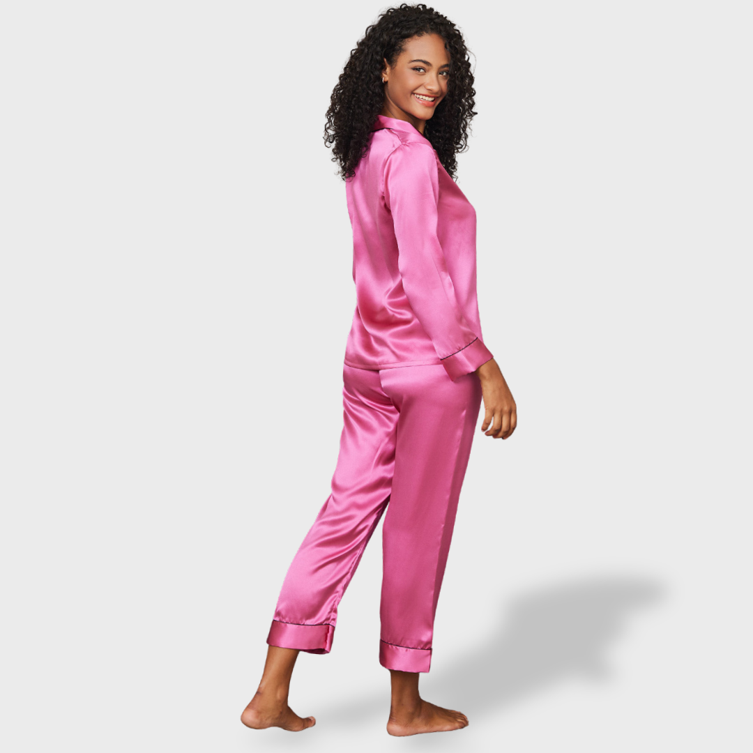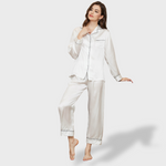 The Adriana set is made from soft, breathable, and lightweight fabric, ideal for sleeping or relaxing at home. Its classic two-piece design includes a long-sleeve shirt with a lapel collar, decorative trims, and a front pocket, paired with regular-fit long pants. Available in several elegant colors, these pajamas combine comfort with a sophisticated touch for any season.