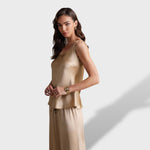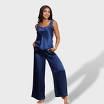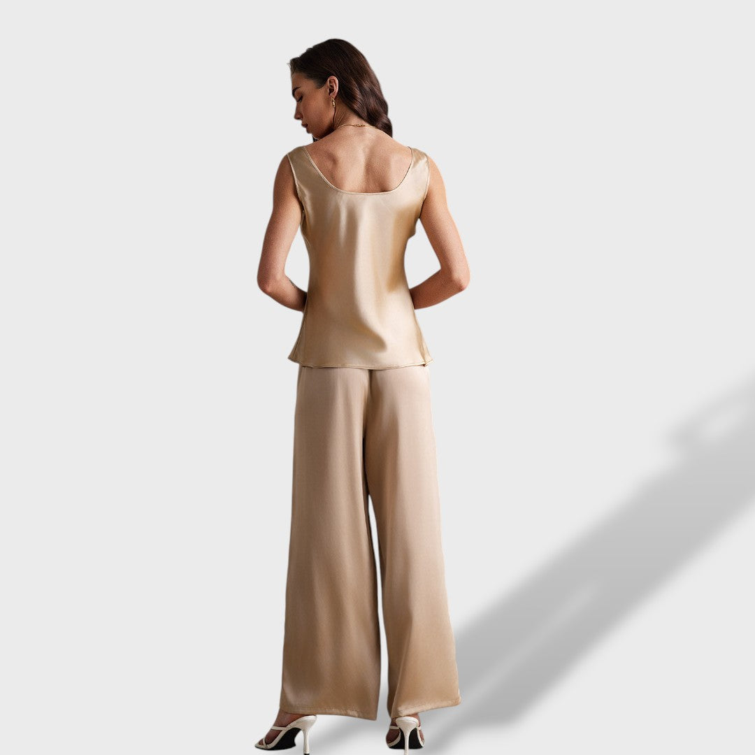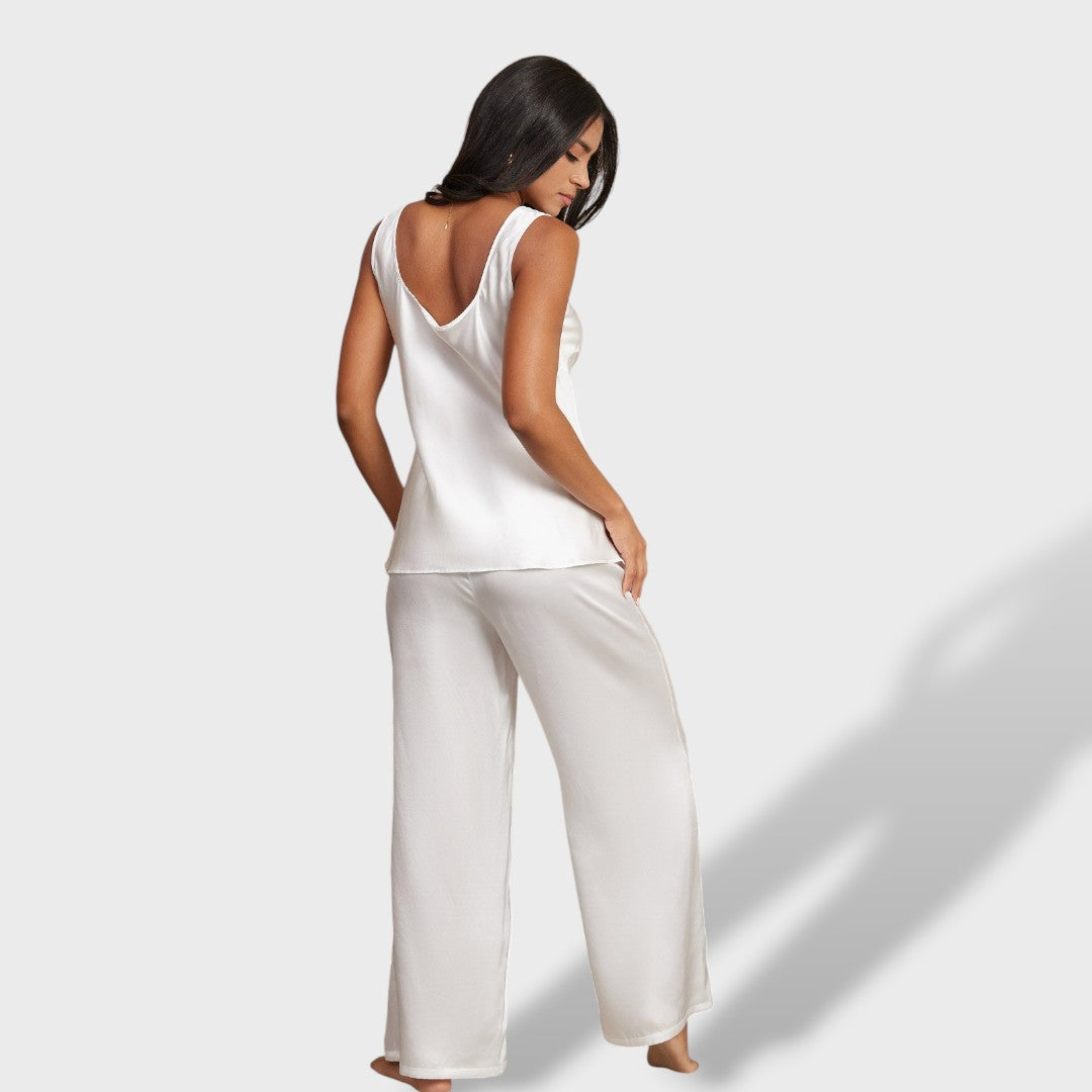 The Clara set combines a lightweight, sleeveless top with wide-leg pants that provide a modern and relaxed style. Its fluid and breathable design ensures freedom of movement and freshness, making it the perfect choice for restful nights or relaxing moments at home.