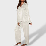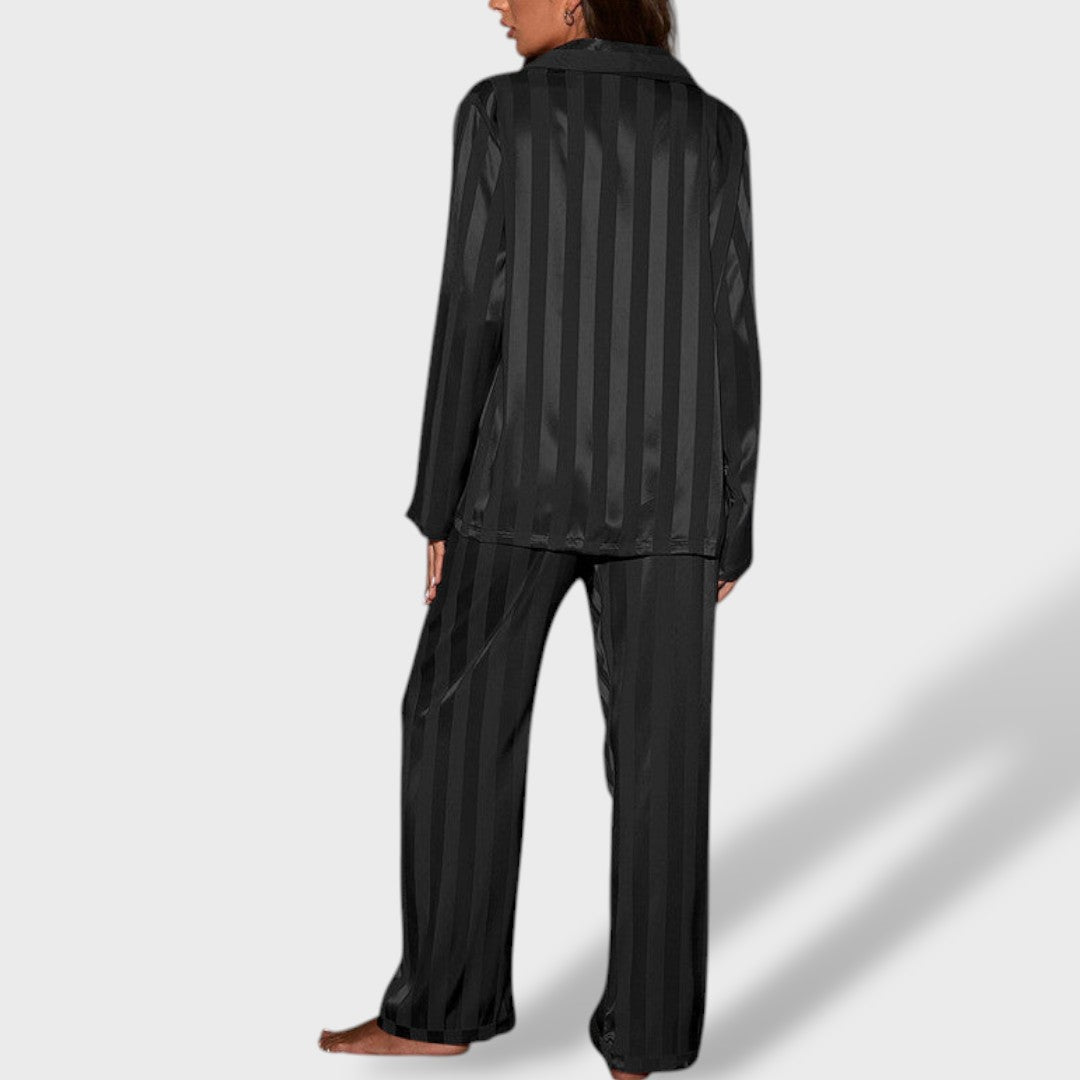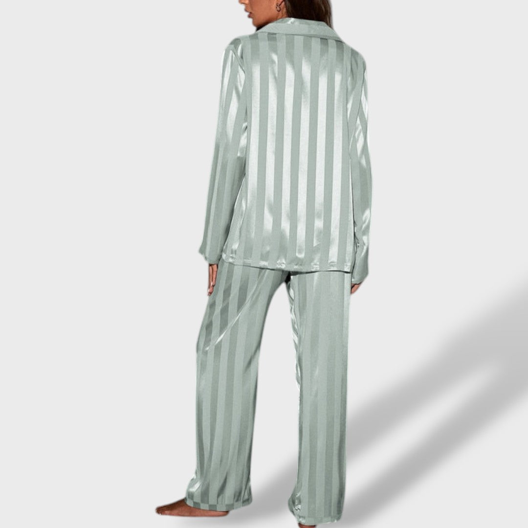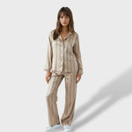 The Marta pajama set combines luxury and comfort for your relaxed nights and mornings. The long-sleeve button-up shirt and matching pants offer a classic and elegant look, while the silky finish provides a luxurious and pleasant feel against the skin. Its loose fit allows for freedom of movement and comfort throughout the day, making it perfect for sleeping, lounging at home, or enjoying a relaxed Sunday.