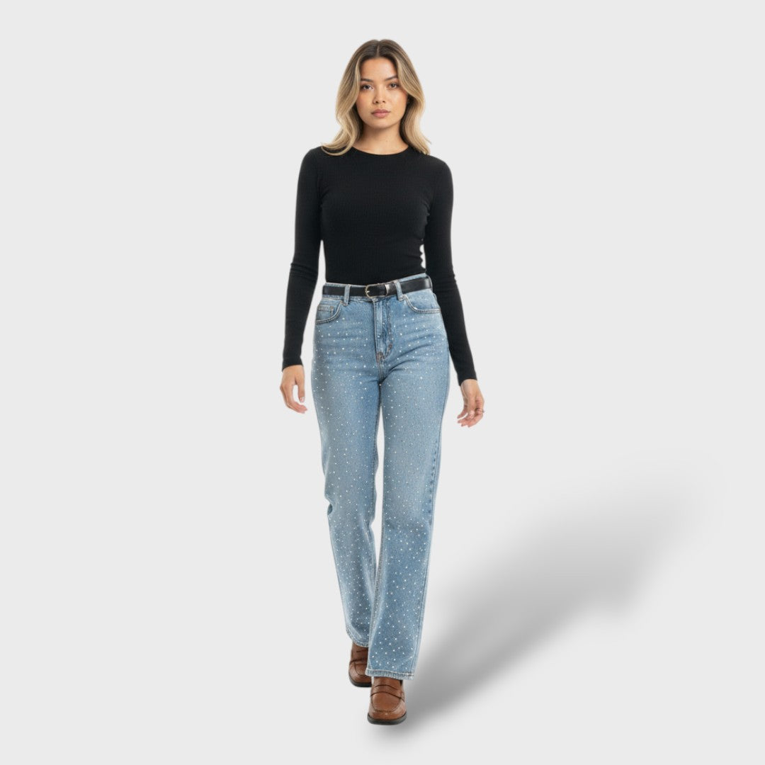 A pair of high-waisted straight pants that combine the classic charm of denim with a touch of sparkle thanks to the diamante details scattered throughout the garment. Made from structured cotton, they offer comfort, a flattering shape, and a striking yet versatile style. Perfect for elevating a daily look or adding a bold touch to a night outfit.