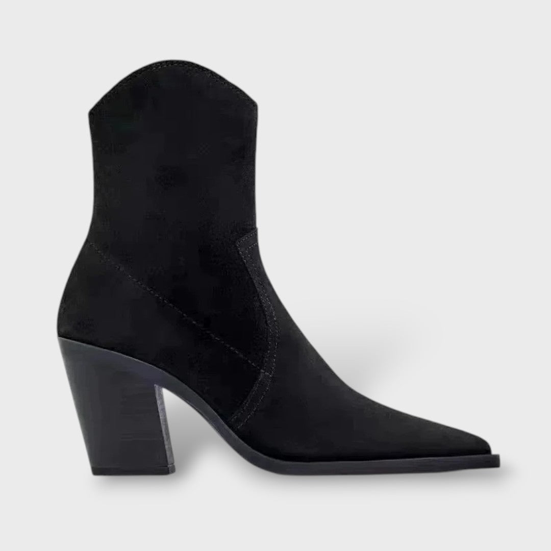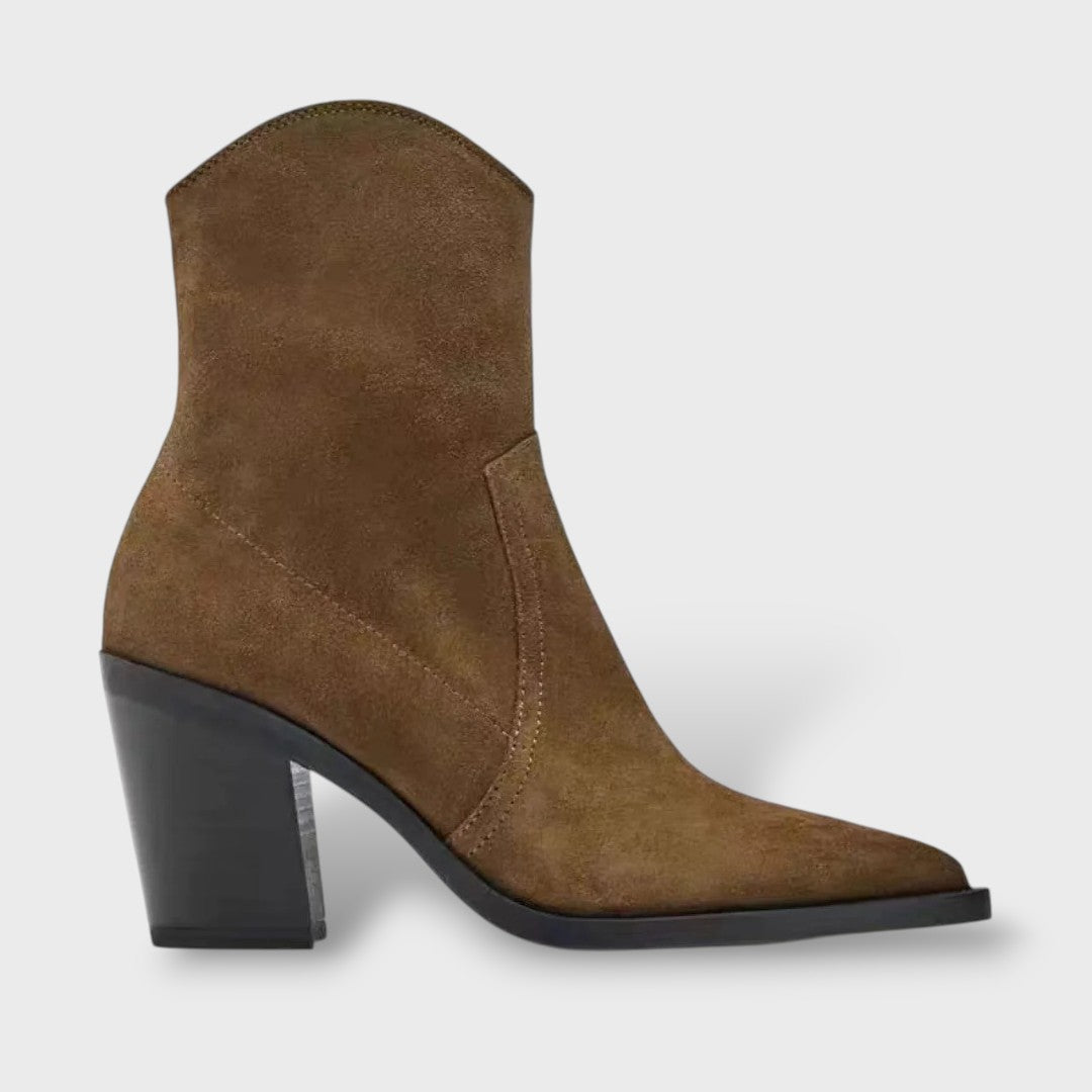 These brown suede ankle boots combine the charm of western style with a modern and refined design. Their pointed toe and square heel create a flattering silhouette, while the side zipper ensures a comfortable and practical fit. Perfect for cool autumn and winter days, they add warmth and sophistication to any look.