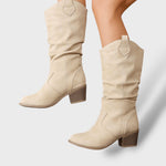 These high-top leather western style boots are the perfect blend of European and American fashion. Their pleated design and chunky heel add a sophisticated yet rebellious air, ideal for those looking to stand out in style.