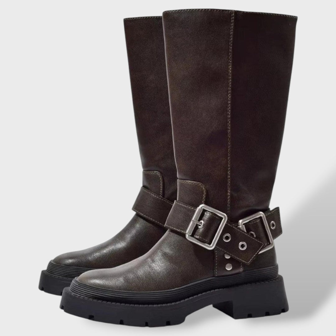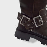 These flat high boots combine the essence of cowboy style with a contemporary and comfortable design. With their high shaft, thick sole, and buckle details, they bring a bold and sophisticated air to your autumn looks. Ideal for everyday wear, they offer versatility and a touch of character without sacrificing comfort.